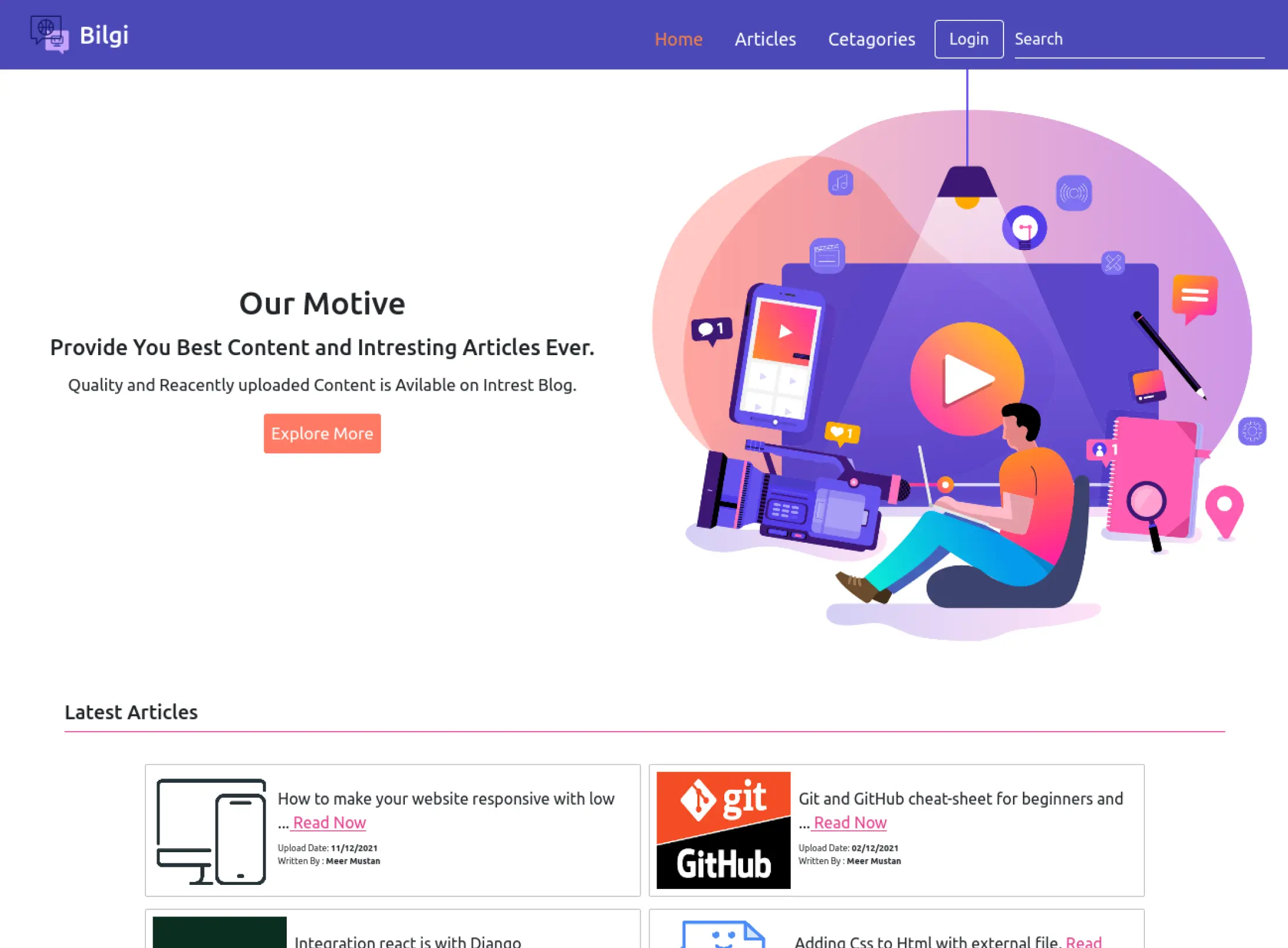 Bilgi Blog is a dynamic blogging platform featuring a clean and user-friendly interface. This web application provides readers with an enjoyable experience, including user registration and login, the ability to engage with blog content through comments.