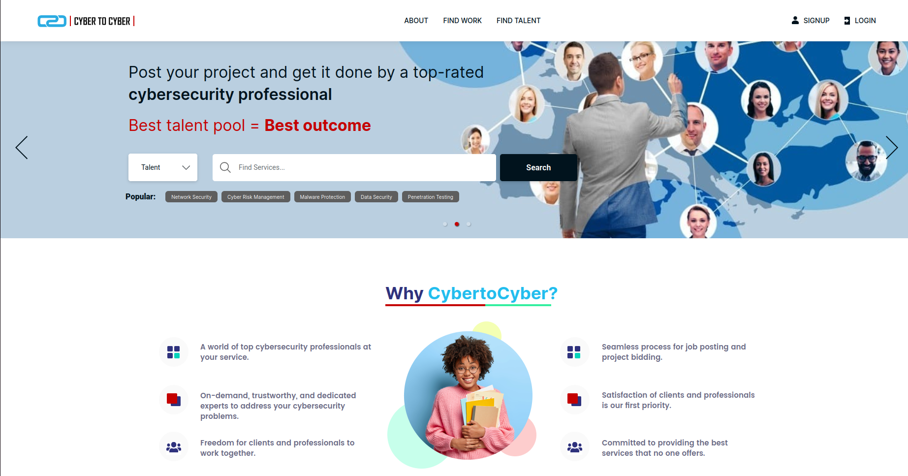- Dual-Role User Ecosystem: Developed and stabilized distinct user journeys for "Cyber Clients" (posting jobs and hiring) and "Cyber Pros" (building profiles and bidding on projects).